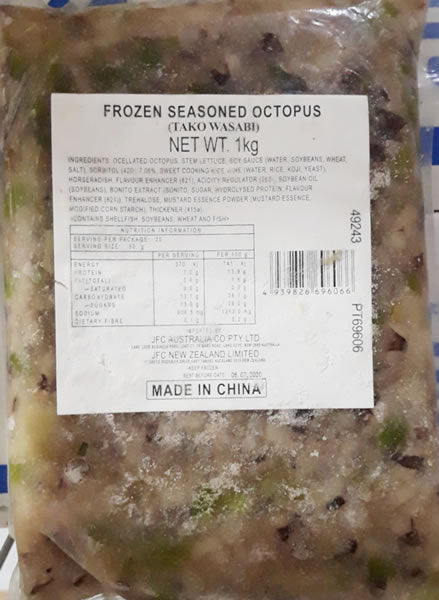 INGREDIENTS:OCTOPUS(57.5%),STEM LETTUCE,SOY SAUCE(WATER,SOY,WHEAT,SALT),SWEETENER(420)7.06%,SWEET COOKING RICE WINE(WATER,RICE,KOJI,YEAST),HORSERADISH,FLAVOUR ENHANCER(621),ACIDITY REGULATOR(262),SOYOIL,BONITO EXTRACT(BONITO,SUGAR,HYDROLYSED PROTEIN(SOY,WATER),FLAVOURENHANCER(621)),SWEETENER(TREHALOSE),SYNTHETIC MUSTARD ESSENCE POWDER(SYNTHETIC MUSTARD ESSENCE,MODIFIED STARCH(1420)),THICKENER(415).