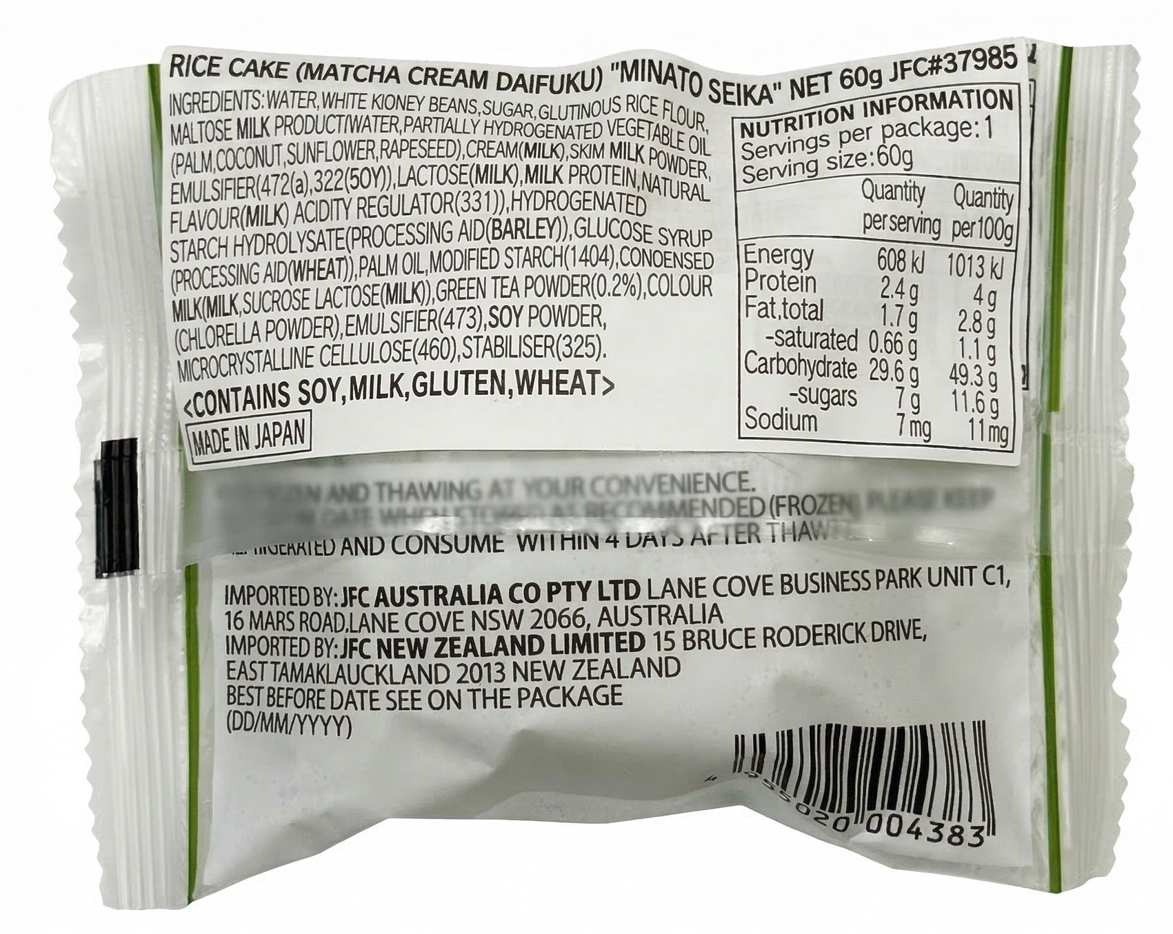 INGREDIENTS:WATER,WHITE KIDNEY BEANS,SUGAR,GLUTINOUS RICE FLOUR(17%),MALTOSE,MILK PRODUCT(4%)(WATER,PARTIALLY HYDROGENATED VEGETABLE OIL(PALM,COCONUT,SUNFLOWER,RAPESEED),CREAM(MILK),SKIM MILK POWDER,EMULSIFIER(472(a),322(SOY)),LACTOSE(MILK),MILK PROTEIN,NATURALFLAVOUR(MILK),ACIDITY REGULATOR(331)),HYDROGENATED STARCH HYDROLYSATE,GLUCOSE SYRUP,VEGETABLE OIL(PALM,CORN,POTATO),ANTI-CAKING AGENT(1404),CONDENSED MILK,GREEN TEA POWDER(0.2%),COLOUR(CHLORELLA POWDER),EMULSIFIER(473),SOY FLOUR,CELLULOSE(460),STABILISER(325).
