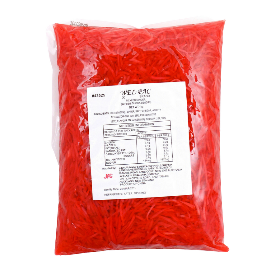 INGREDIENTS: GINGER(58%),WATER,SALT,VINEGAR(2.5%),ACIDITY REGULATOR(260,330,296),PRESERVATIVE(202),FLAVOUR ENHANCER(621),COLOUR(102,124).