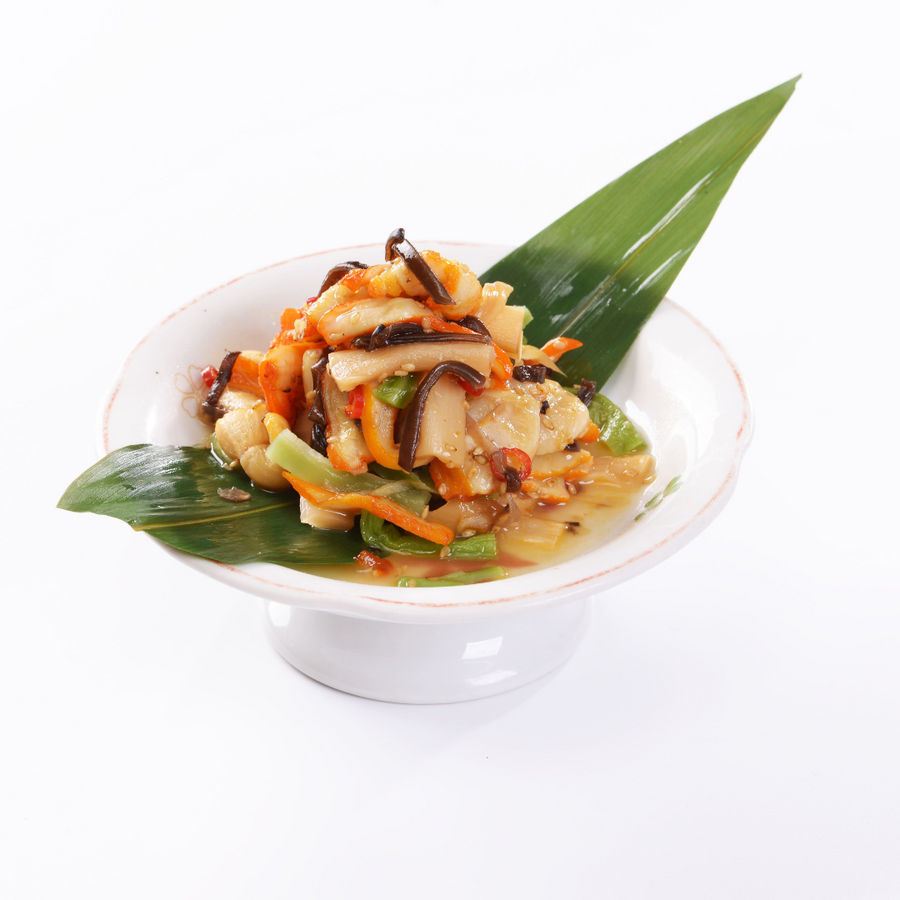 INGREDIENTS: HUMBOLDT SQUID(50%),BLACK FUNGUS MUSHROOM(10%),BAMBOOSHOOTS(8%),SUGAR,STEM LETTUCE(5%),SWEETENER(420),SWEET COOKING RICEWINE(WATER,GLUTINOUS RICE,KOJI,YEAST(CONTAINS SOY)),HYDROLYSED SOYPROTEIN,VINEGAR,SALT,GINGER,SESAME OIL,SESAME,FLAVOUR ENHANCER(621),CHILLI PEPPER,FLAVOUR ENHANCER(631,627),COLOUR(100,120).