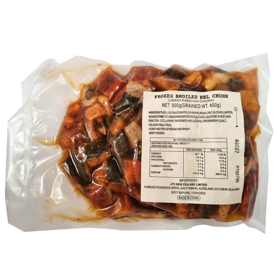 INGREDIENTS: EEL(90%),SOY SAUCE(WATER,SOY,WHEAT,SALT,ALCOHOL),WATER,SUGAR,FERMENTED SEASONING(WATER,RICE,ALCOHOL),GLUCOSE SYRUP,HIGHFRUCTOSE CORN SYRUP,THICKENER(1440),ALCOHOL,THICKENER(415),SALT,COLOUR(150A,160B).