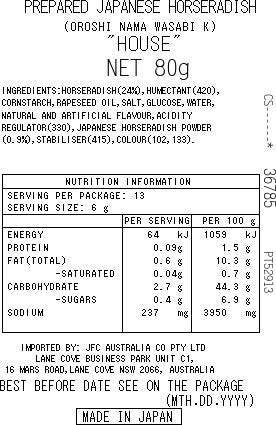 INGREDIENTS:HORSERADISH(24%),HUMECTANT(420),CORNSTARCH,RAPESEED OIL,SALT,GLUCOSE,WATER,NATURAL AND ARTIFICIAL FLAVOUR,ACIDITYREGULATOR(330),JAPANESE HORSERADISH POWDER(0.9%),STABILISER(415),COLOUR(102,133).