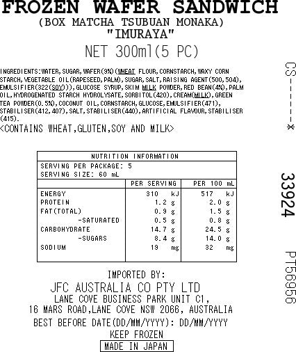 INGREDIENTS:MATCHA FLAVOURED FILLING(WATER,SUGAR,SKIM MILK POWDER,GLUCOSE SYRUP,VEGETABLE OIL(PALM,COCONUT),CREAM(MILK),GREEN TEAPOWDER,GLUCOSE,EMULSIFIER(471),STABILISER(410,412,407),ARTIFICIALFLAVOUR),BEAN JAM(SUGAR,WATER,RED BEAN,HYDROGENATED STARCHHYDROLYSATE,RED BEAN JAM,SORBITOL(420),GLUCOSE SYRUP,CORNSTARCH,SALT),WAFER(WHEAT FLOUR,CORNSTARCH,RAPESEED OIL,PALM OIL,SUGAR,SALT,RAISING AGENT(500,504),EMULSIFIER(322(SOY)),CALCIUM HYDROXIDE(526)).