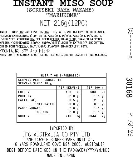 INGREDIENTS:SOYBEAN PASTE(WATER,SOYBEANS,RICE,SALT),WATER,ETHYL ALCOHOL,SALT,FLAVOURENHANCER(621,631,627),SEAWEED,HYDROLYSEDPROTEIN(SOYBEANS,SEA BREAM,TUNA,SPANISHMACKEREL),BONITO EXTRACT(DRIED BONITOSHAVINGS,SUGAR).